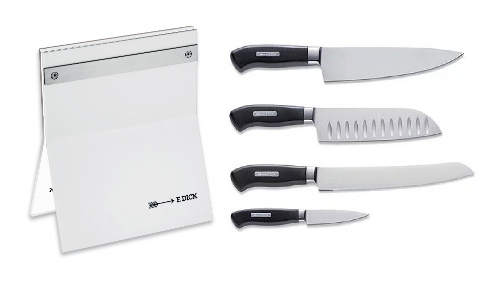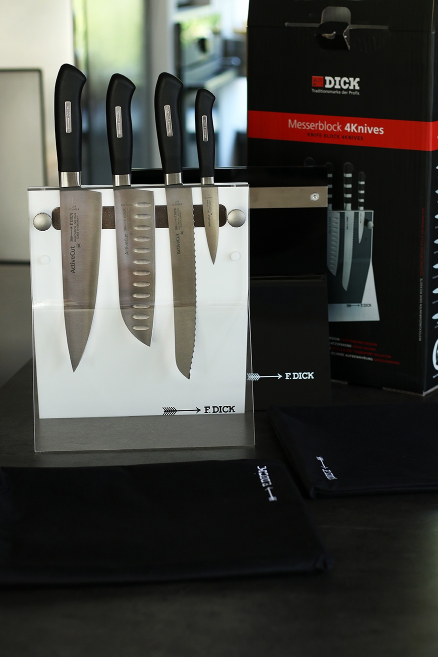 Bílý magnetický stojan Dick na nože se skládá se ze dvou částí, mezi které nože zasouváte. Zadní bílá část má magnetickou lištu, na které nože drží. Přední průhledná akrylová část plní především bezpečností úlohu, aby se při práci někdo o nože nezranil. Lze ji kdykoliv oddělit díky 2 otáčecím šroubům, například kvůli čištění.