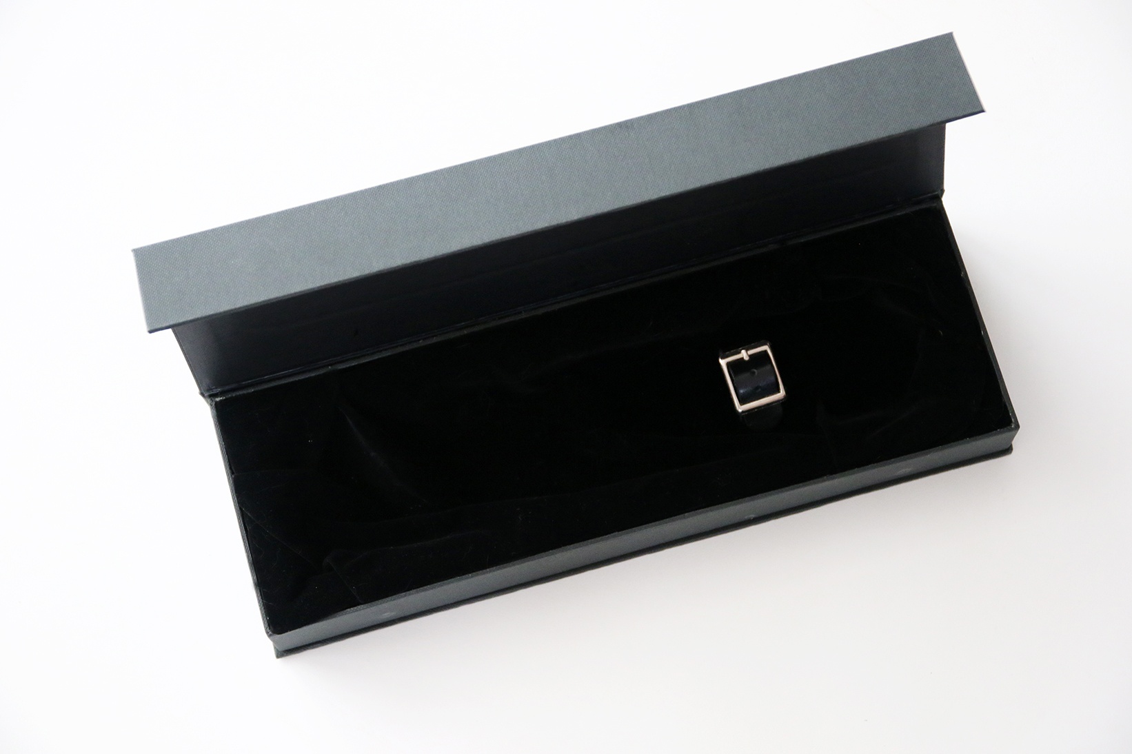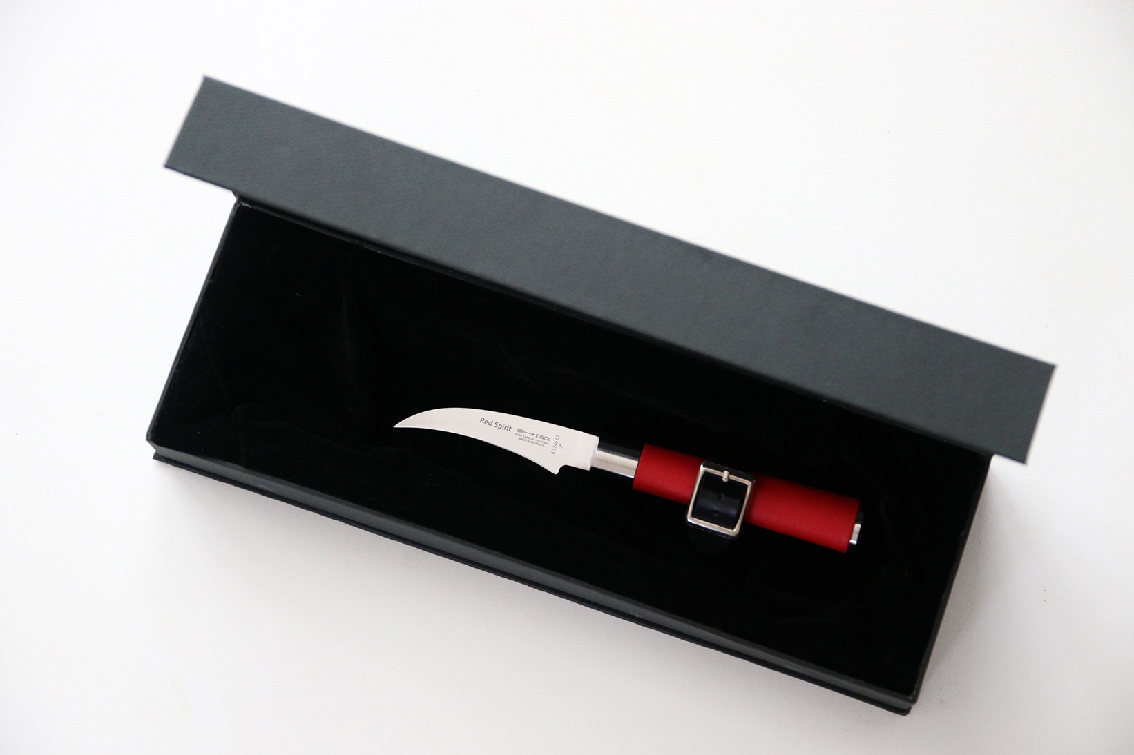 Dárková krabička pro jeden nůž maximální délky 15 cm čepele v černém polstrování. V krabičce jsou nože fixovány magnetem, který zabraňuje pohybu ostří a přezkou, která zase drží rukojeť na místě. Dotek luxusu.