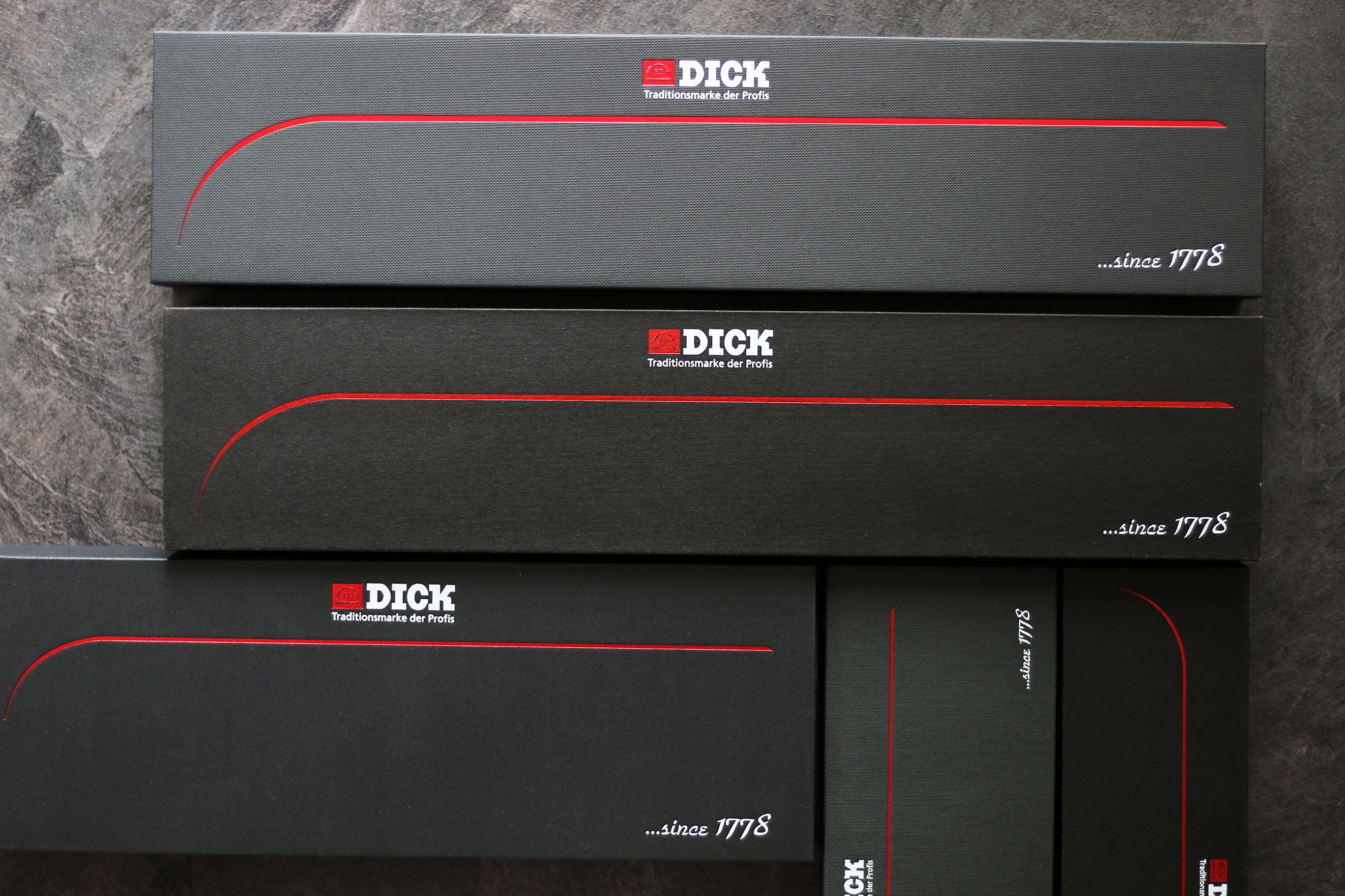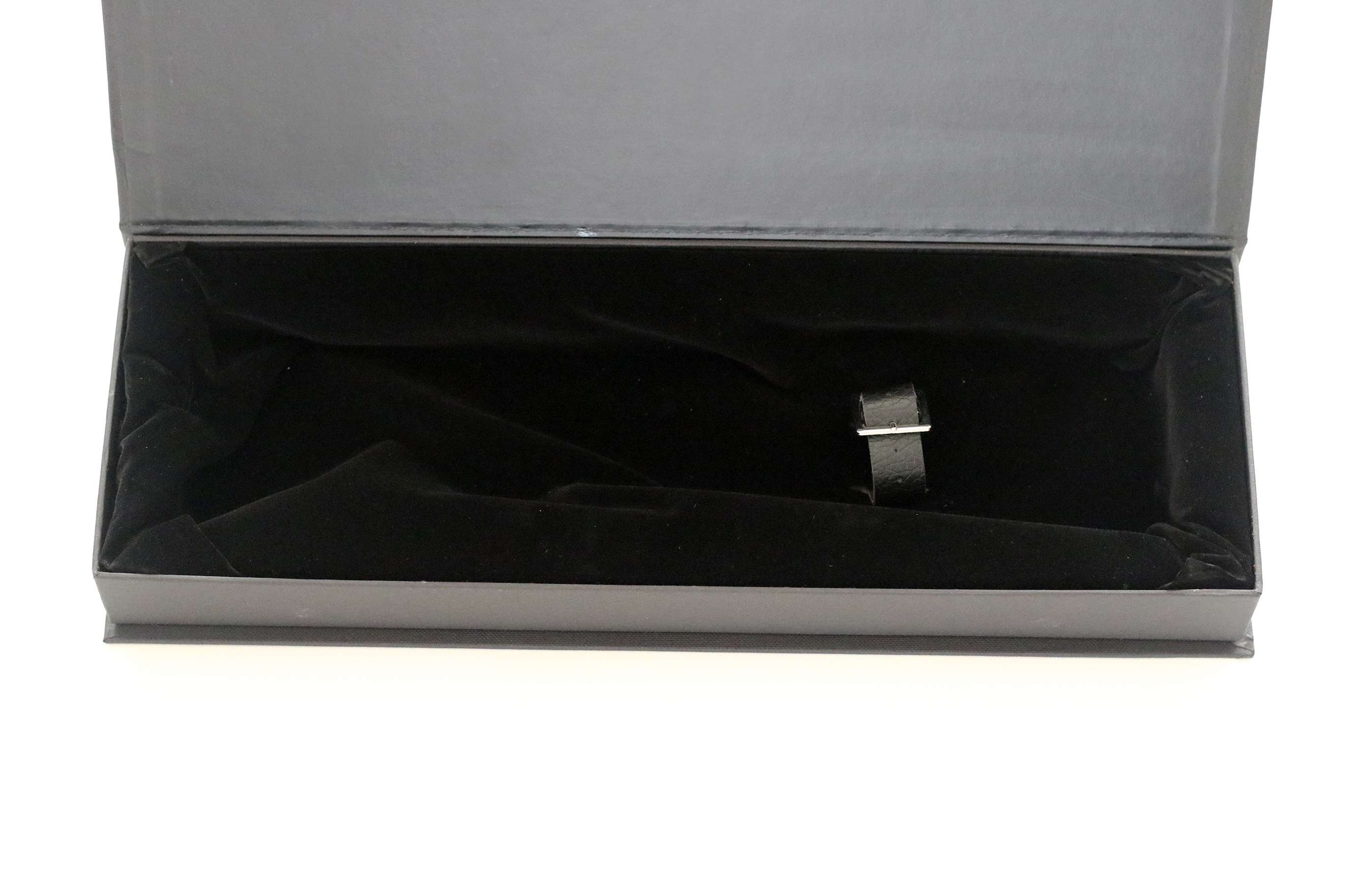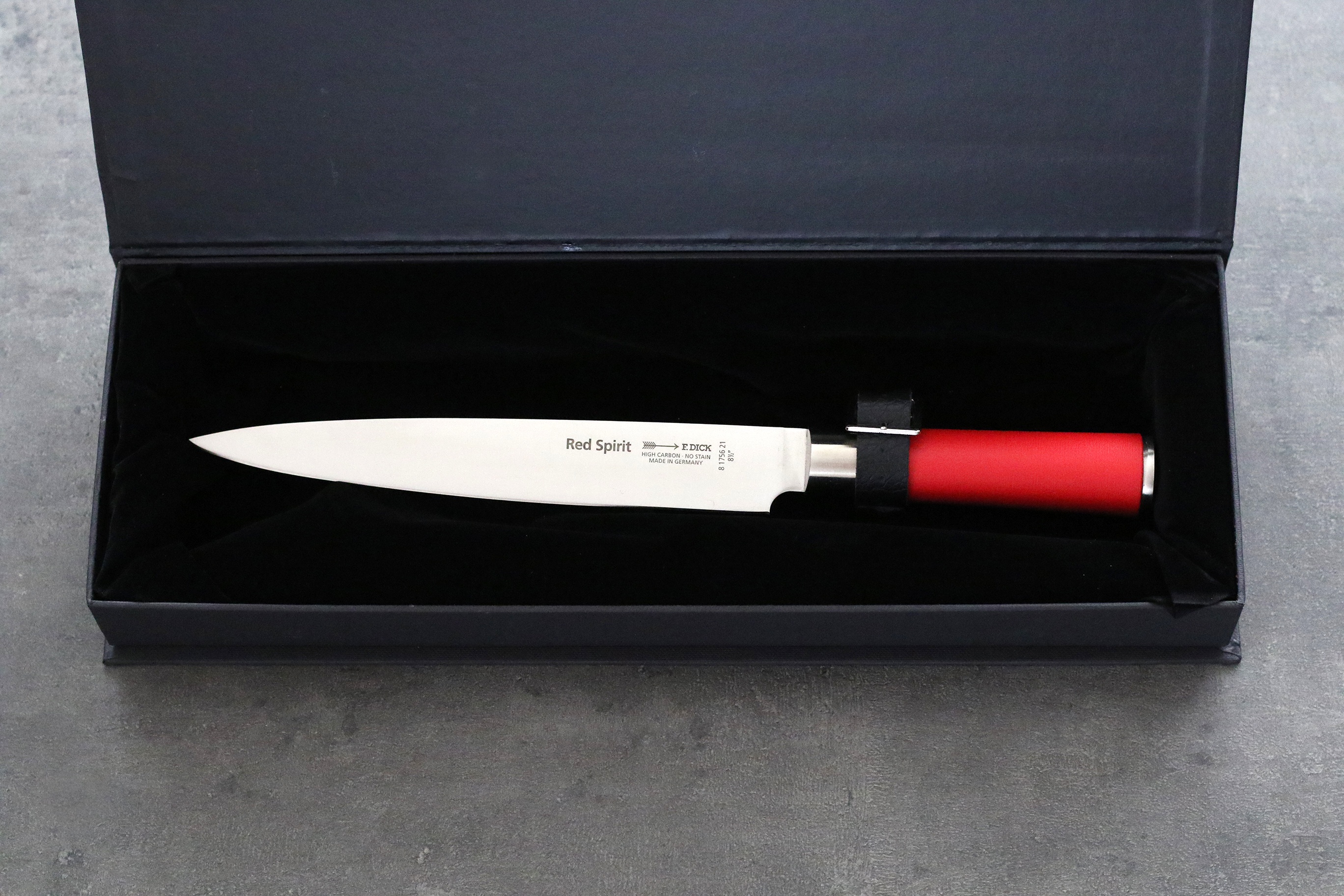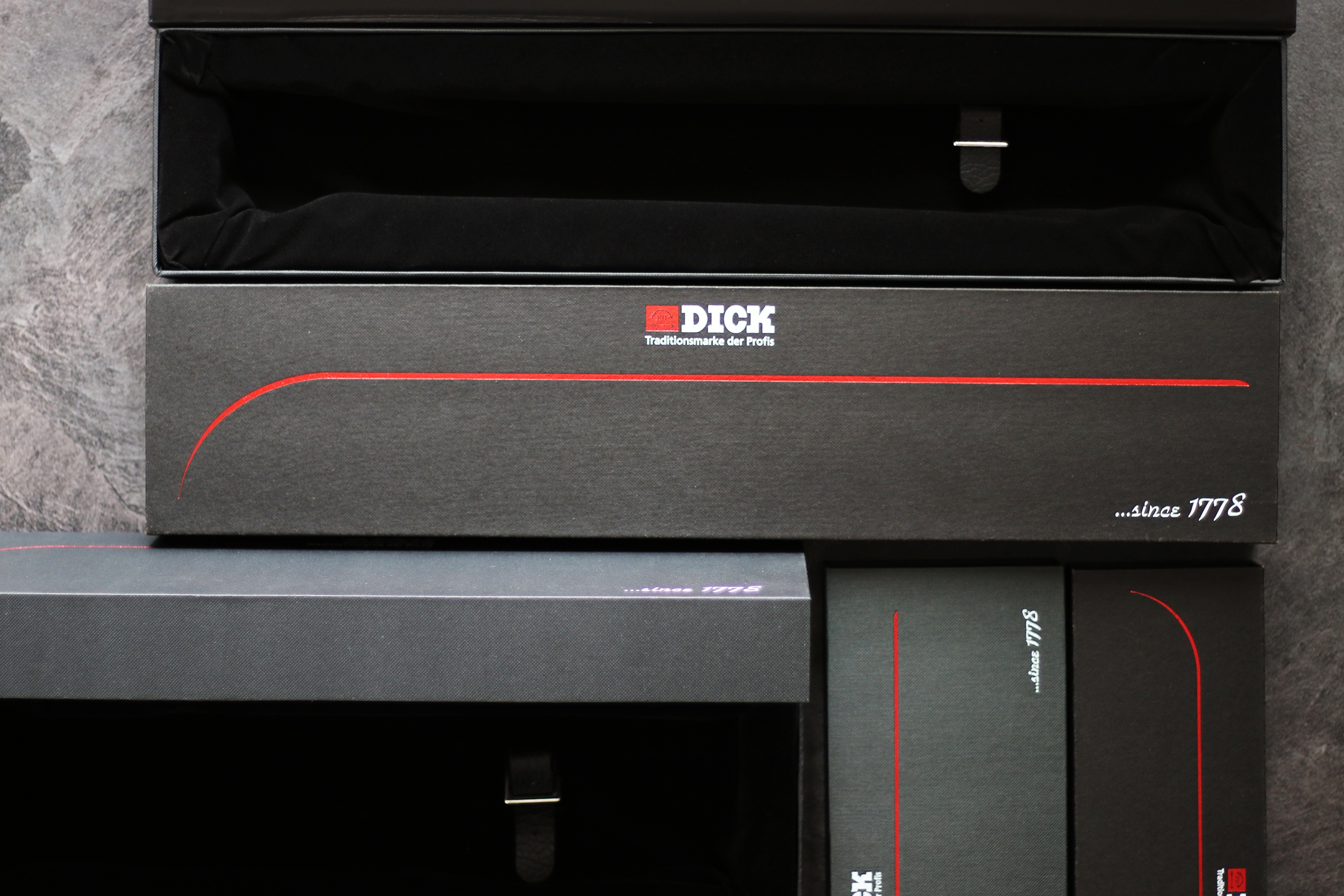 Dárková krabička pro jeden nůž maximální délky 21 cm čepele v černém polstrování. V krabičce jsou nože fixovány magnetem, který zabraňuje pohybu ostří a přezkou, která zase drží rukojeť na místě. Dotek luxusu.