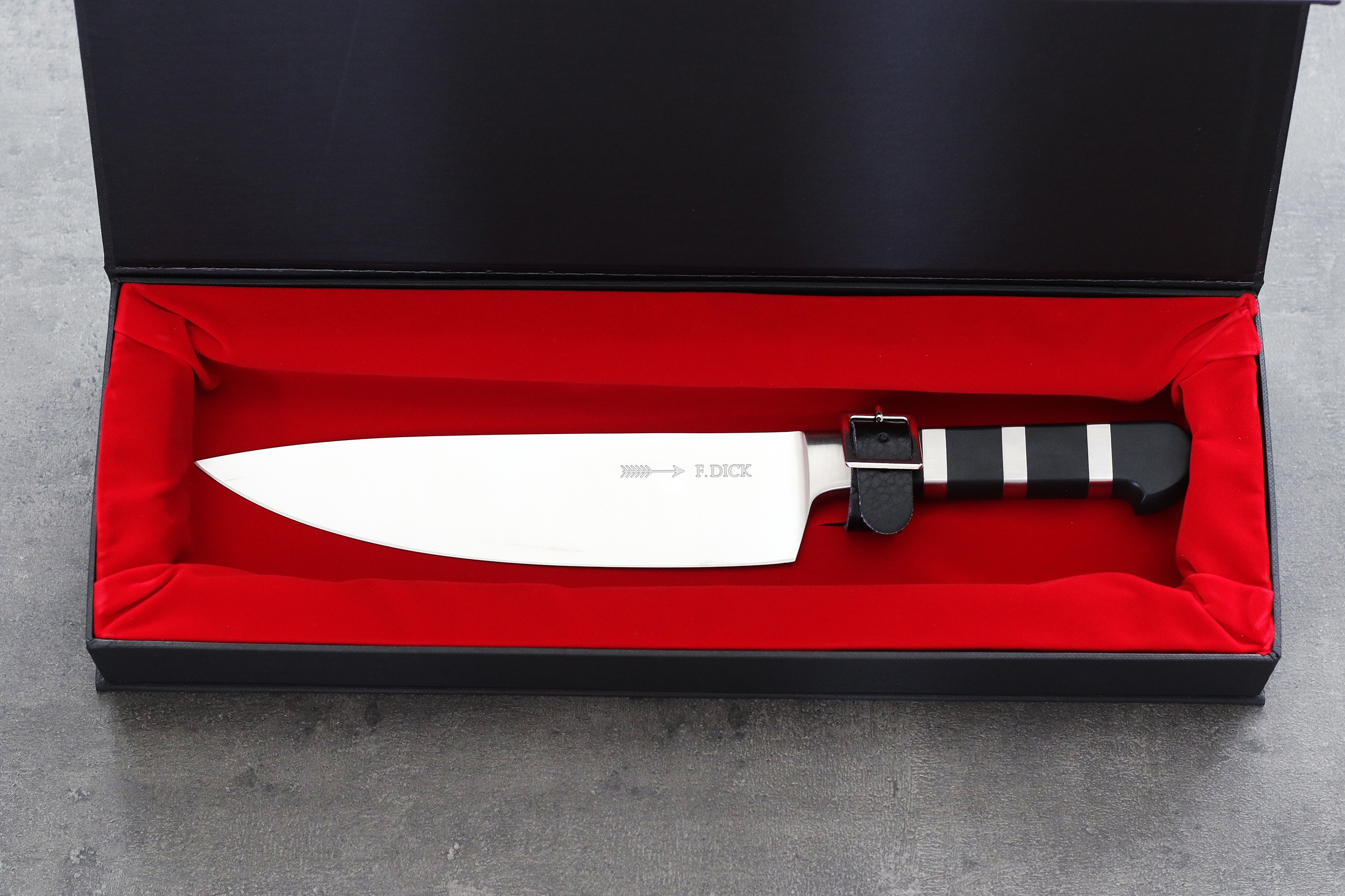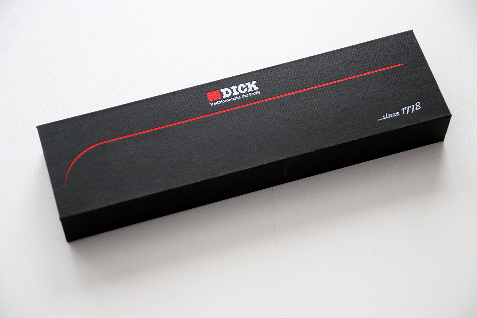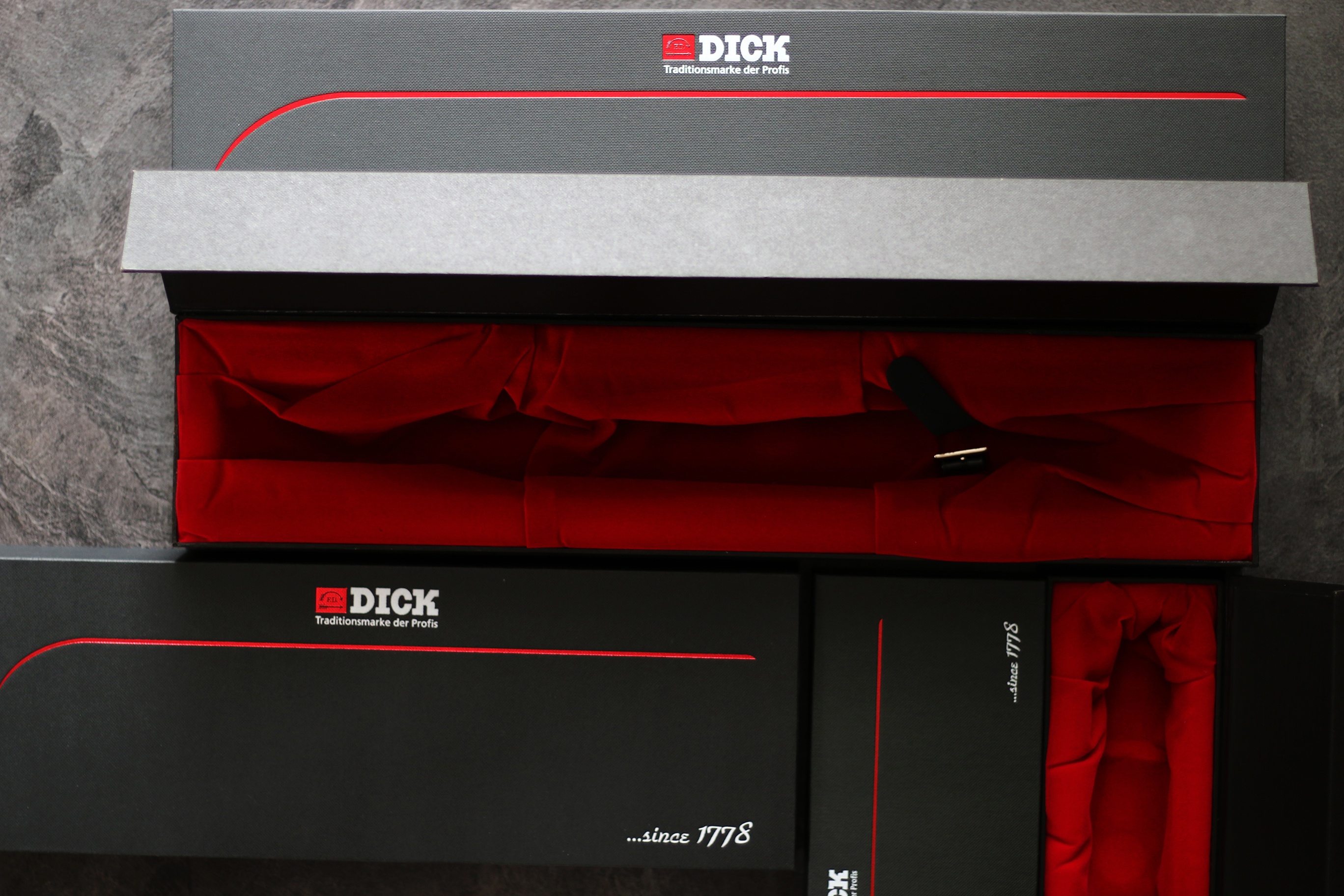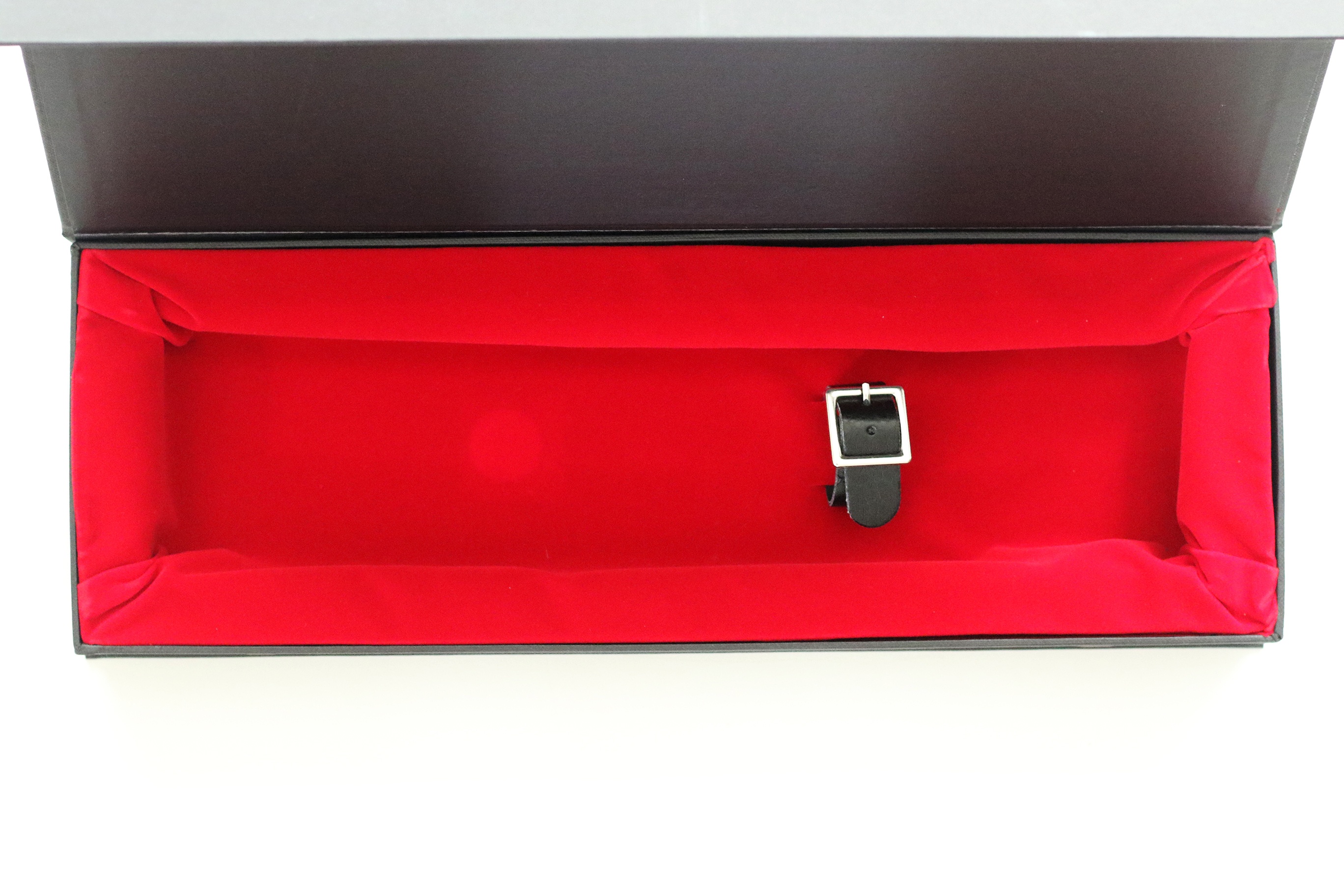 Dárková krabička pro jeden nůž maximální délky 21 cm čepele v červeném polstrování. V krabičce jsou nože fixovány magnetem, který zabraňuje pohybu ostří a přezkou, která zase drží rukojeť na místě. Dotek luxusu.