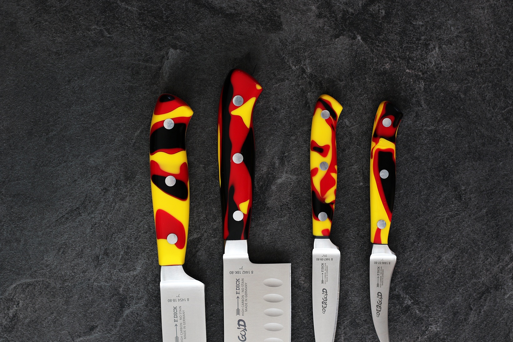 Go for Gold je nová edice nožů vytvořená ve spolupráci s Německým národním kulinářským týmem. Dokonale ostrá čepel a ergonomická rukojeť s unikátním designem, který nepřehlédnete. Série obsahuje všechny potřebné typy nožů pro profesionální i domácí vaření - na zeleninu, okrajování menších surovin i klasický kuchařský. Go for Gold a Německý národní kulinářský tým spojuje vášeň, cit pro dokonalost a kreativitu - zkrátka vše, co na své cestě za úspěchem kuchaři potřebují.