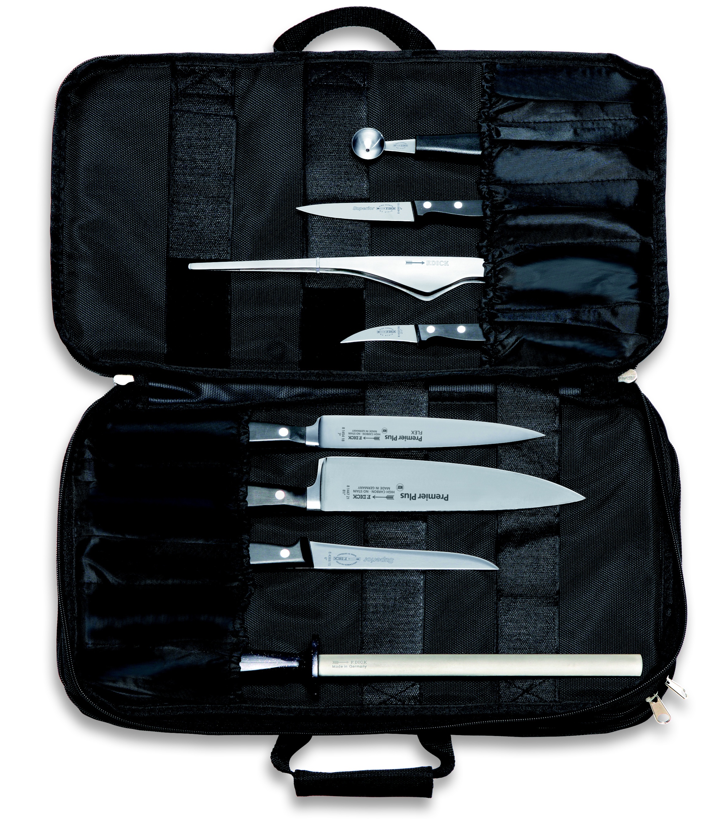 Navštěvujete kurz vaření, studujete na kuchaře nebo chcete mít své nože i s oblíbenou kuchařkou a zápisníkem vždy mobilní, například při cestě na chalupu? Bude s Vám hodit tato taška. Kuchařská taška 34dílná (s místem na 34 nástrojů)  obsahuje kované příslušenství z oblíbené série Premier Plus. Taška se skládá ze tří částí. Dvě části jsou pro 34 nožů a nástrojů,  jedna část je určena pro knihy a psací potřeby.