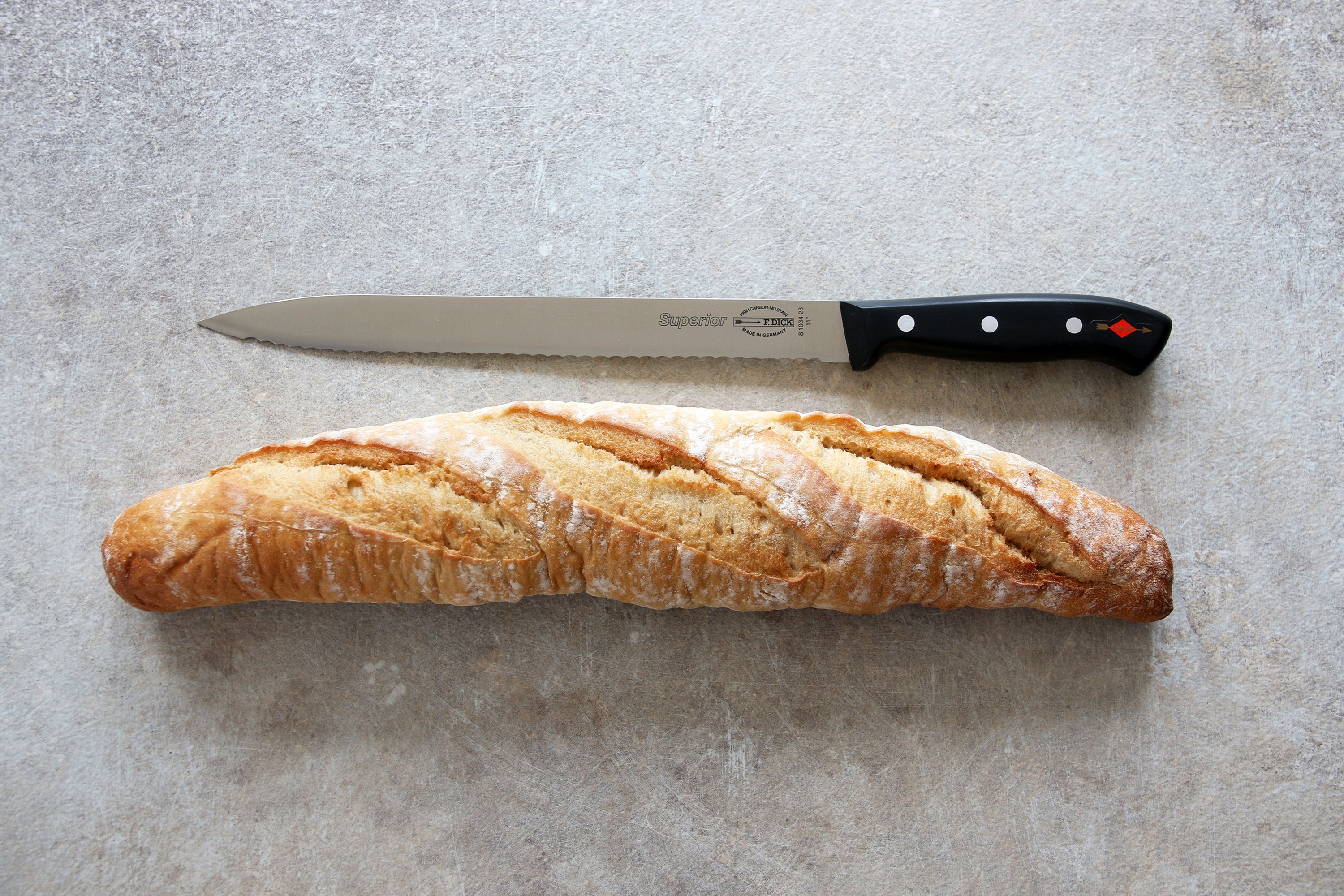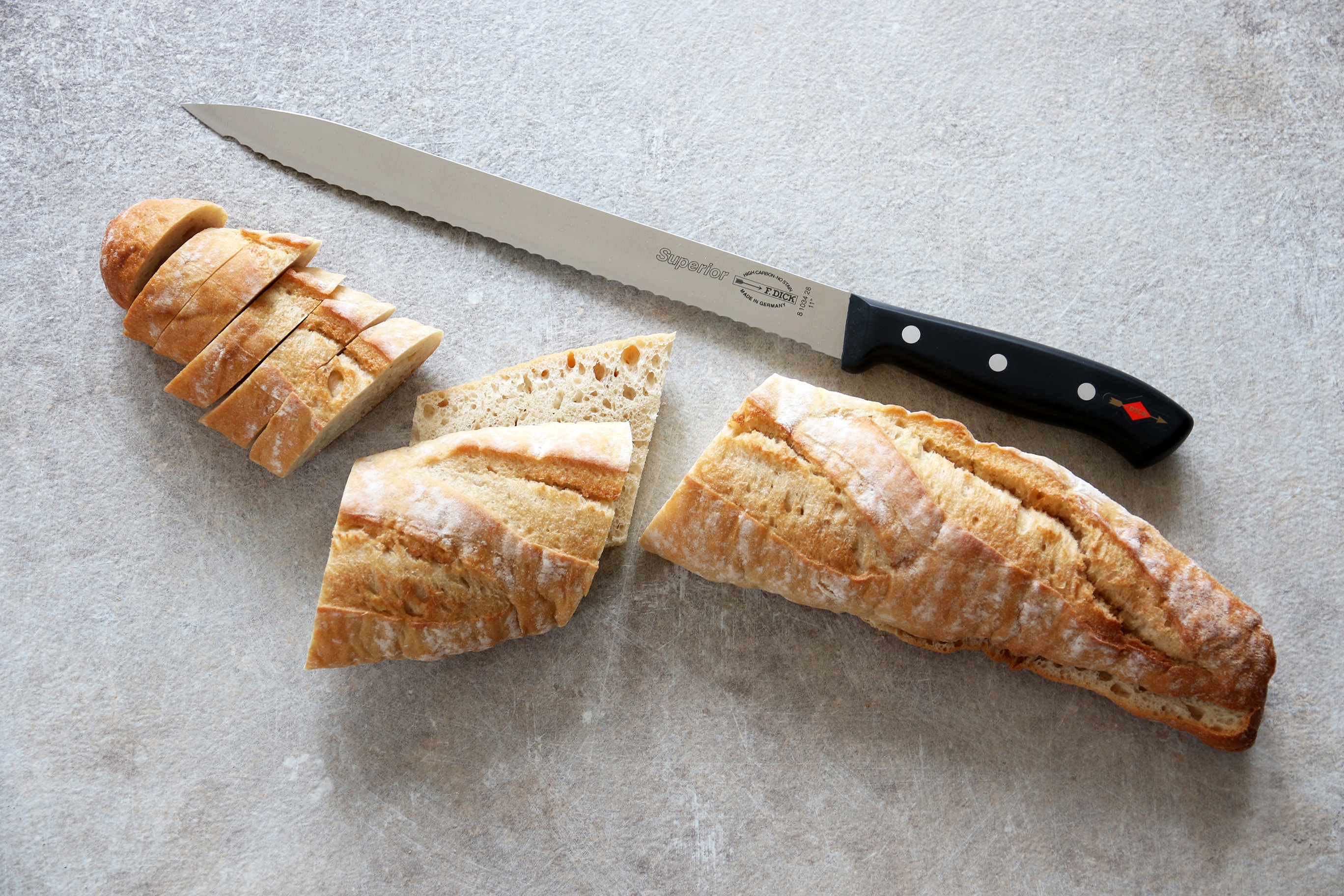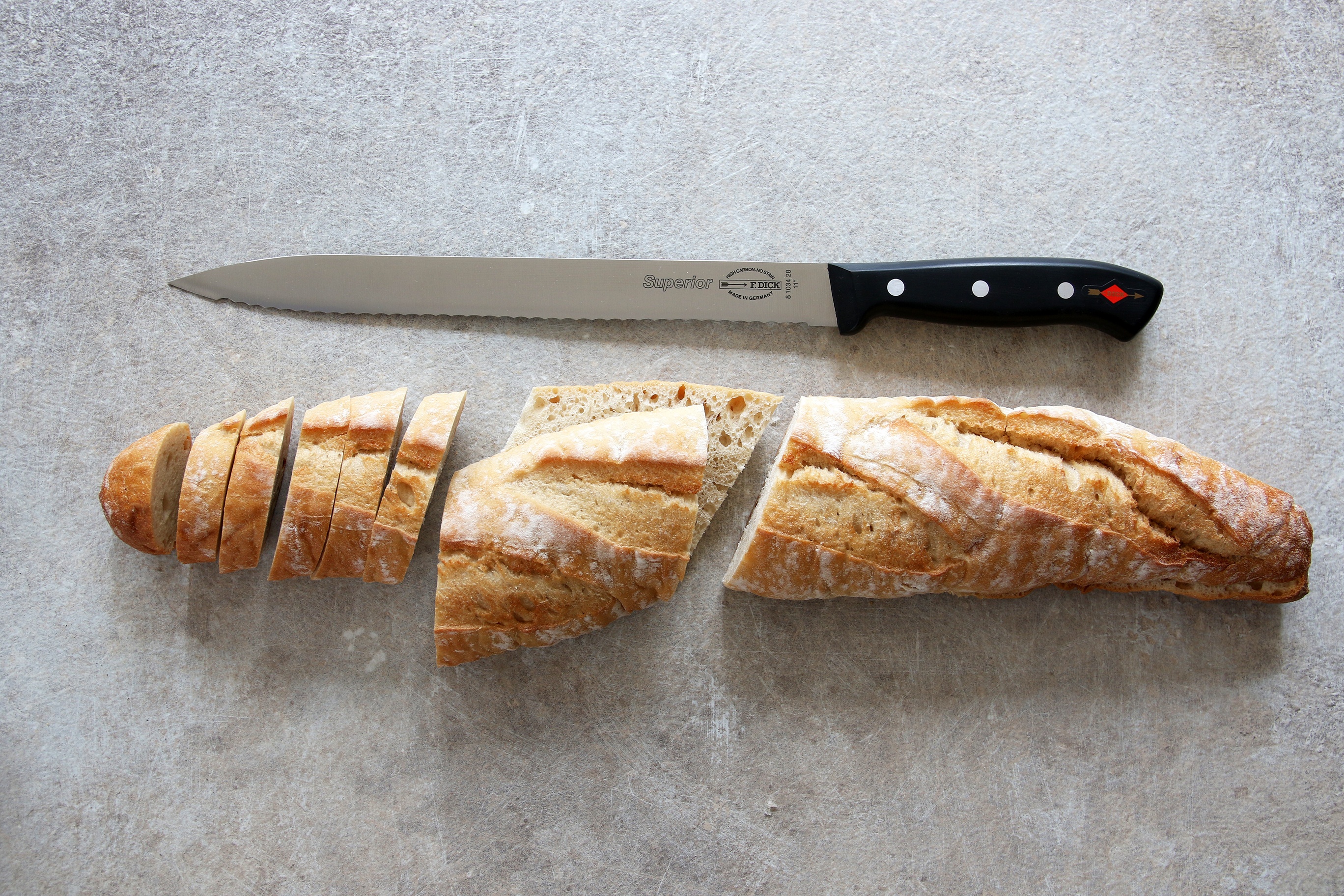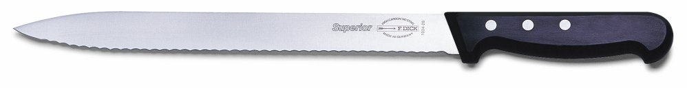 Losos nebo plátky šunky vypadají a chutnají lépe, když jsou nařezané na plátky tenké jako papír. O to se postará nářezový nůž, pro který je takové krájení díky své délce hračka. Tento nůž ze série Superior je navíc opatřen vlnitým výbrusem, který usnadní krájení například chleba, dlouhých baget nebo velkého ovoce s kůrkou.