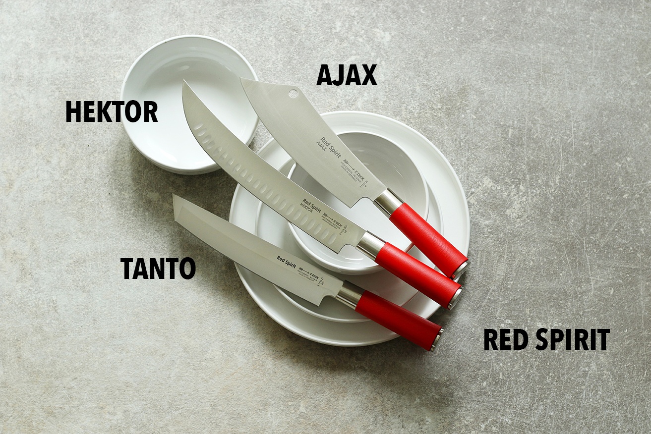 V této trojici nesmí chybět nůž Tanto. Poznáte ho nejen podle kulaté červené rukojeti, ale hlavně díky tvaru čepele s dvojfázovým ostřím. Na co byste řekli, že se tento mimořádně ostrý nůž hodí? Na krájení masa, ale i zeleniny. A pozor! Na rozdíl od Hektora nebo Ajaxe, nůž Tanto najdete pouze u série Red Spirit.