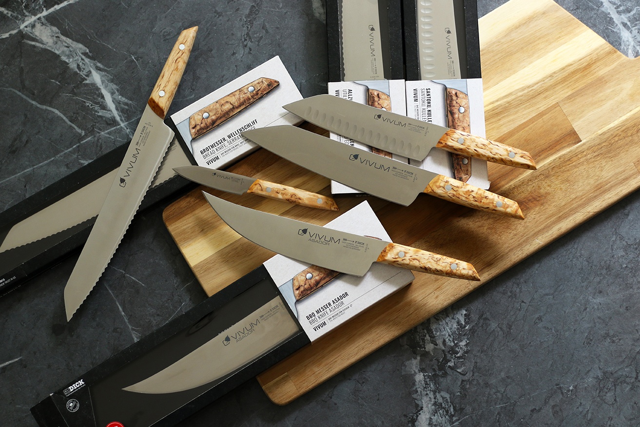 Nová řada nožů – VIVUM. Tyto jedinečné nože kombinují přirozený vzhled s extrémní ostrostí: elegantní a speciálně tvarovaná rukojeť z březového dřeva se spojuje s nejkvalitnější ocelí nože a moderním designem čepele. Díky velmi zvláštní kresbě dřeva je každá rukojeť VIVUM jedinečná. Tvar rukojeti nejen působivě vypadá, ale také příjemně padne do ruky. Pro řadu VIVUM je použita speciální vysoce legovaná ocel nabízející vynikající řezný výkon, výjimečnou tvrdost a odolnost proti korozi.