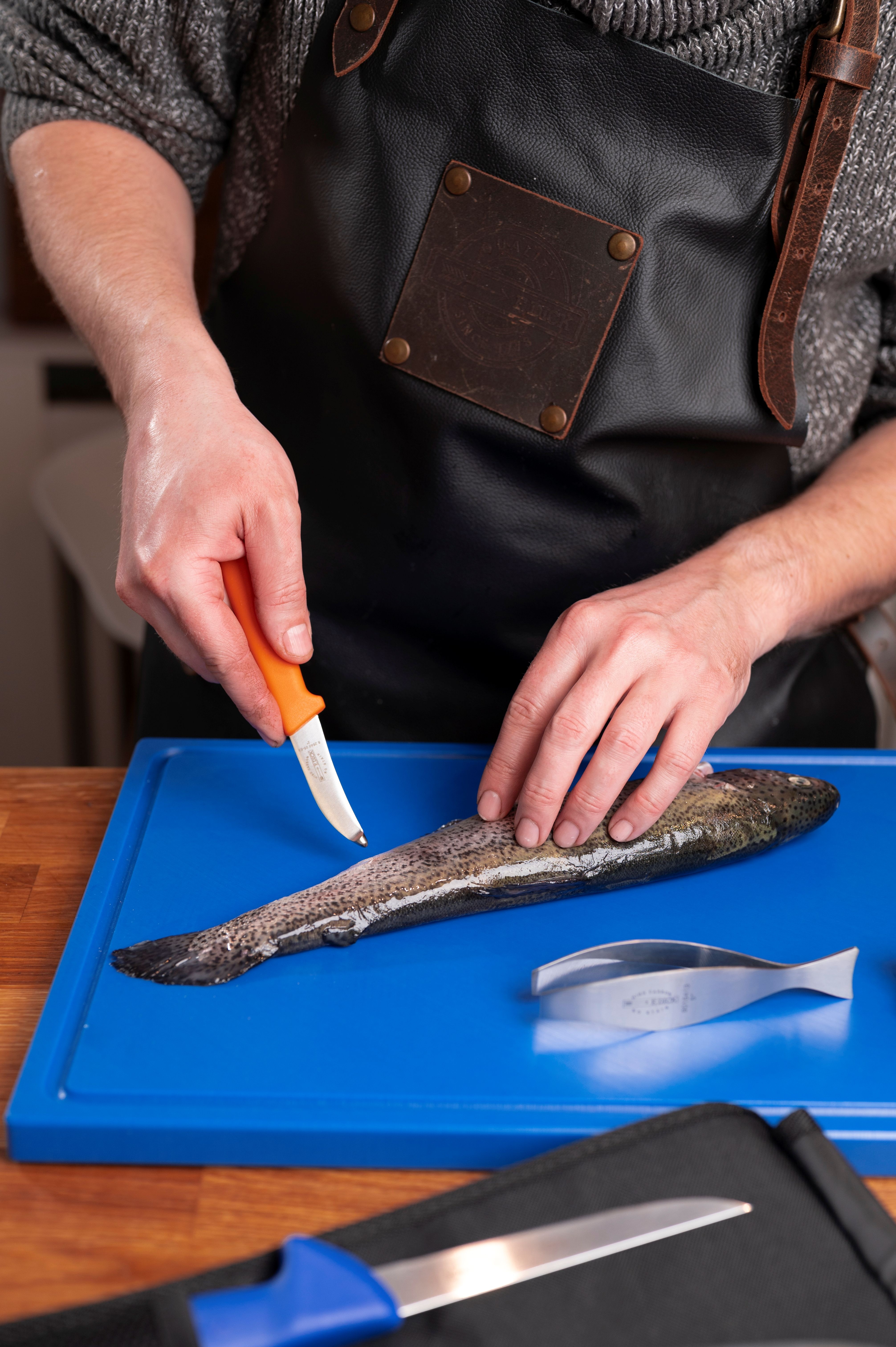 Nůž zajistí bezpečné otevření břišní dutiny ryby, přičemž kulička na špičce zabrání poškození vnitřností.