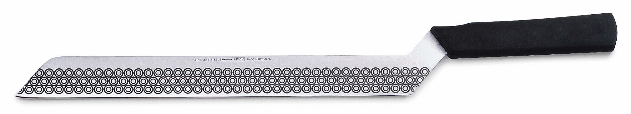 Speciální vzorek na čepeli tohoto nože na sýr umožňuje samovolné uvolnění plátků měkkých druhů sýra z čepele. Zalomená rukojeť poskytuje dostatek prostoru mezi rukou vedoucí řez a prkénkem.