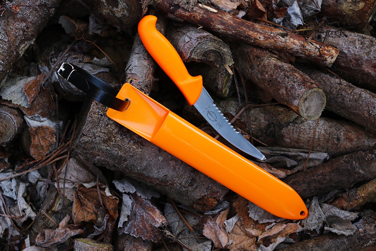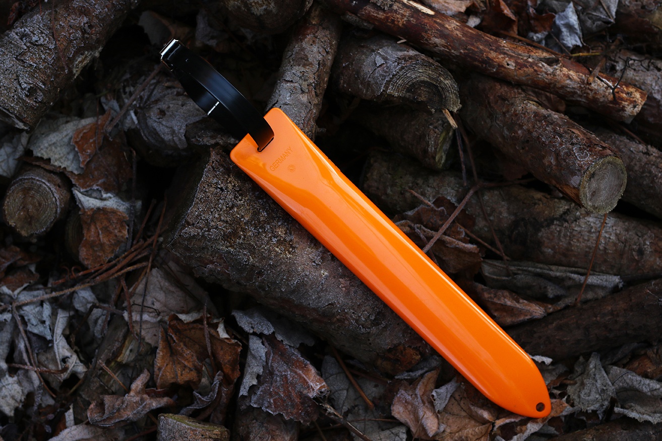 Pouzdro nože je vyrobeno z odolného plastu, který chrání čepel před vnějšími vlivy, jako jsou nárazy a vlhkost. Díky výrazné barvě lze pouzdro nože rychle najít v hustém podrostu nebo za špatných světelných podmínek. Díky plastovým materiálům se snadno čistí a je hygienický.