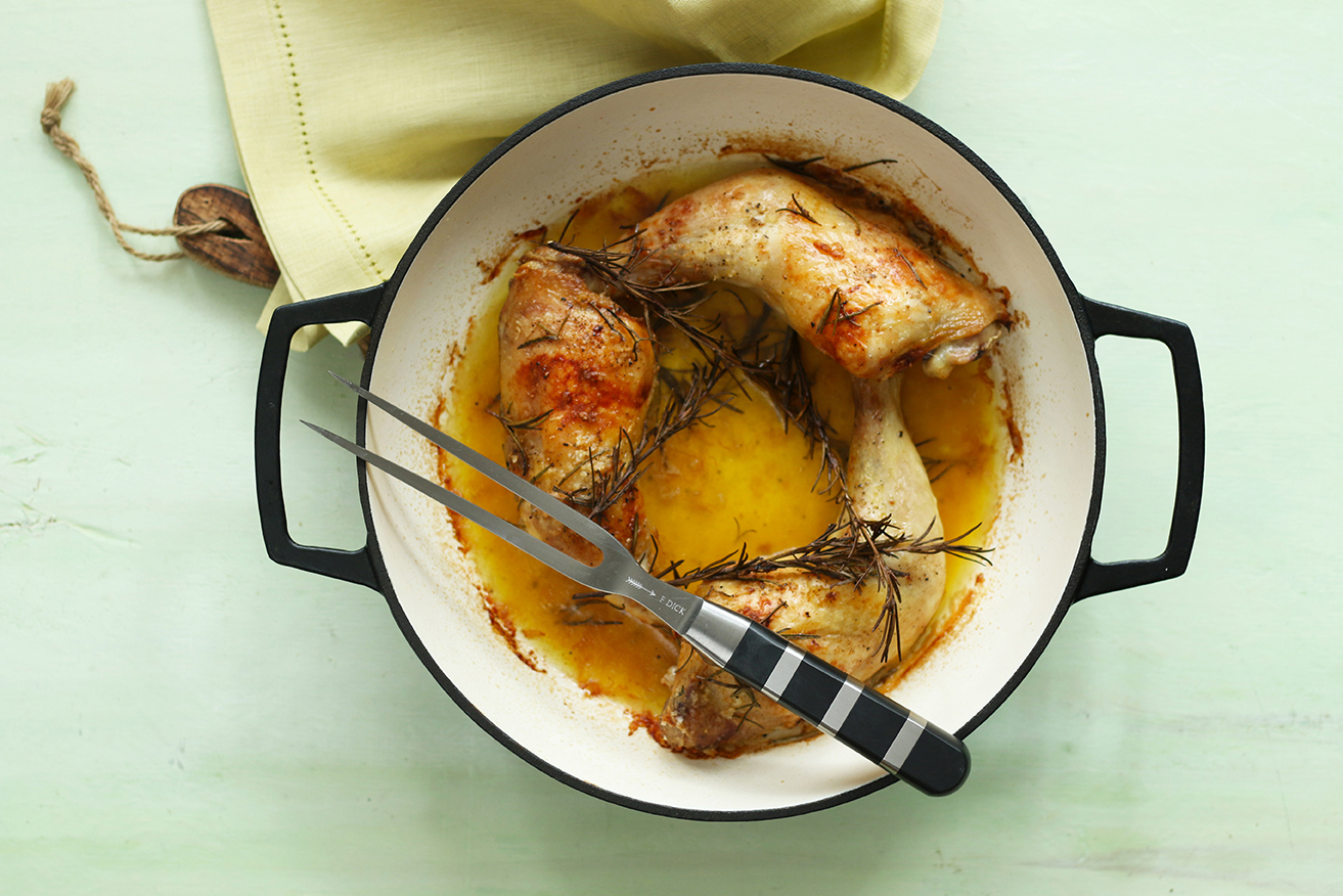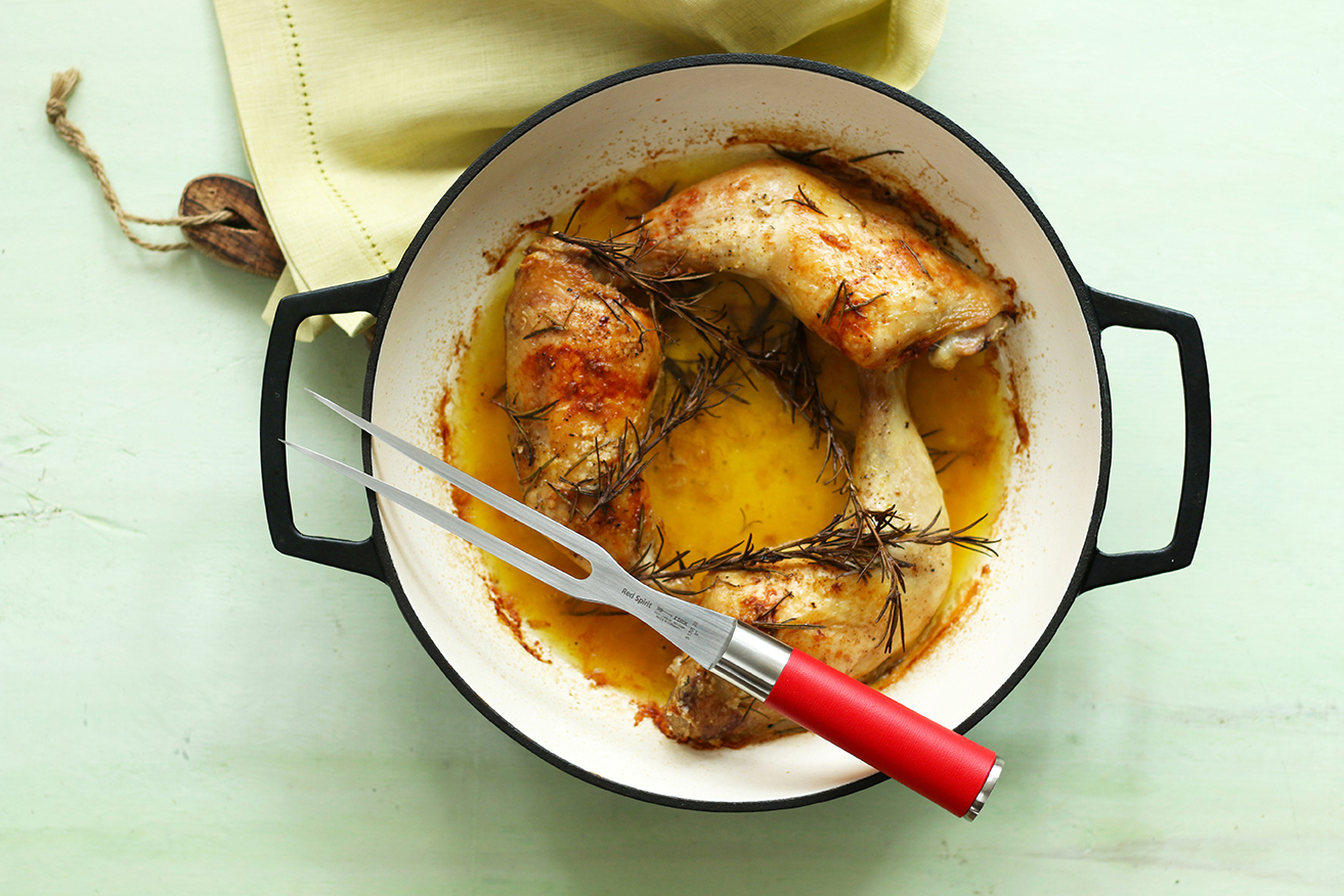 K jaru stejně tak patří dokonale upečené farmářské kuře! Potřebujete jen sůl, pepř, snítky rozmarýnu, trošku másla a servírovací vidličky. Pokud máte doma sérii nožů 1905, pak si ji doplňte o dranžírovací vidličkus délkou 20 cm. Patříte k těm, kdo dávají přednost sérii Red Spirit? I v té naleznete vidličku, která se hodí s přípravou pečeně.