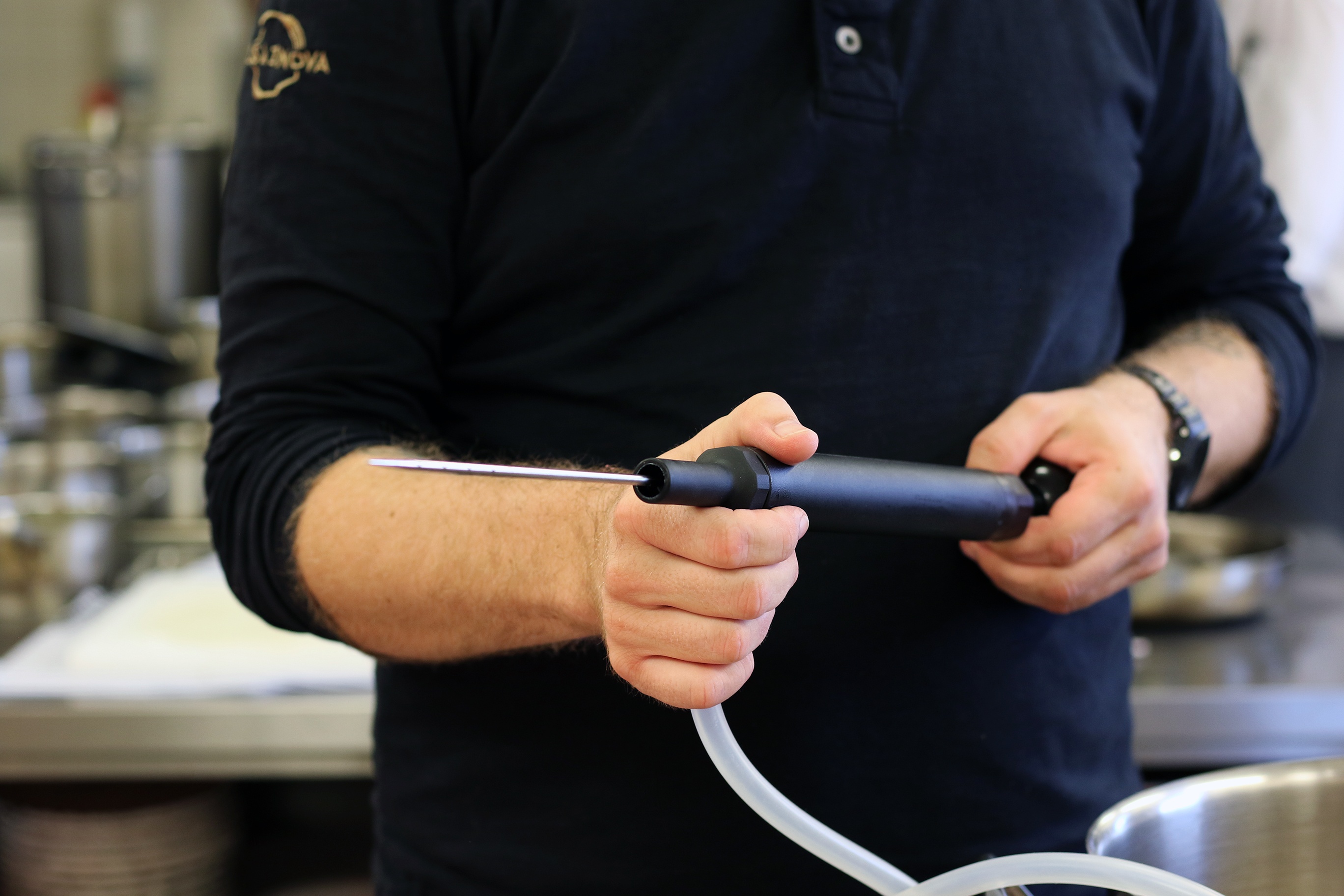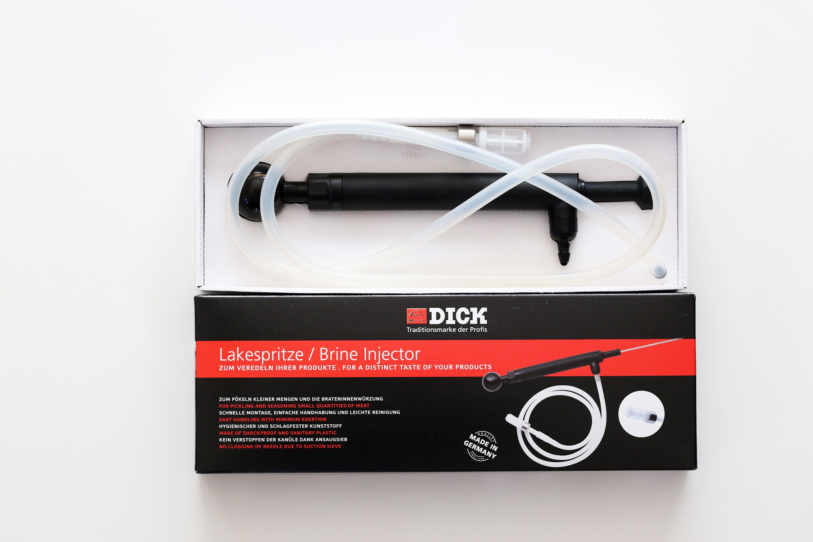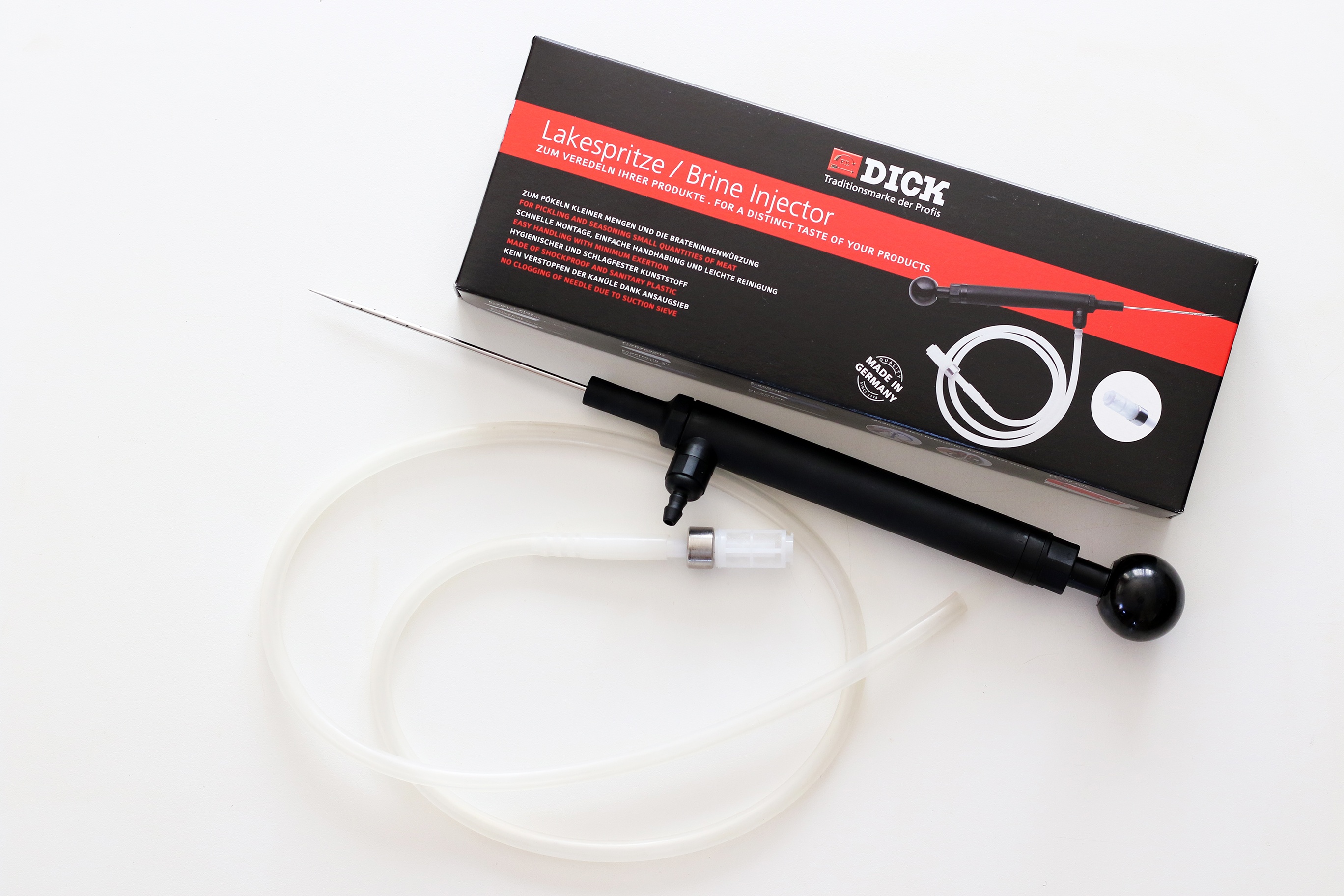 Ochucený lák si připravíte do misky či dózy, do které ponoříte volný konec hadičky. Ruční nastřikovačka F. DICK je kvalitní plastový nástroj, u kterého dochází při vytažení pístu k nasátí láku. Při stlačení pístu k vytlačení (vstříknutí) láku děrovanou jehlou po celé její délce a tím pádem k aplikaci láku do masa.