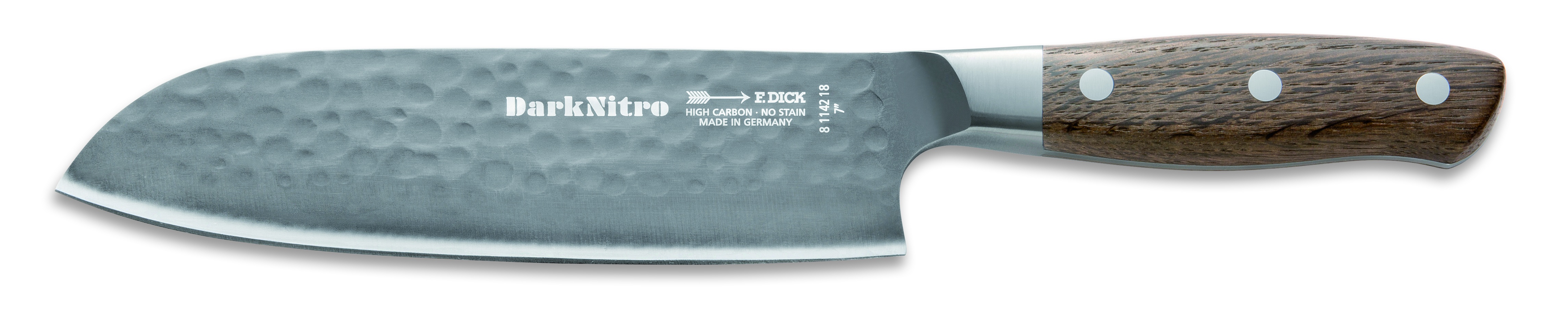 Nože jsou vytvořeny spojením jedinečné čepele s tepaným povrchem a karbonovým vzhledem a také rukojetí z cenného nezničitelného dubového dřeva. Funkční, vyvážený, extrémně tvrdý. Tenká čepel, zkosená záštita a ergonomická rukojeť dělají z nožů z řady DarkNitro prvotřídní nůž. Antracitová čepel je barvena pomocí speciálního procesu šetrného k životnímu prostředí. To dává nožům jejich čistou industriální krásu. Tepaná úprava čepele podtrhuje její jedinečnost a funkčnost. Dubová rukojeť symbolizuje vytrvalost, moc a sílu. Ostrá a jasná linie rukojeti posiluje estetiku nože.