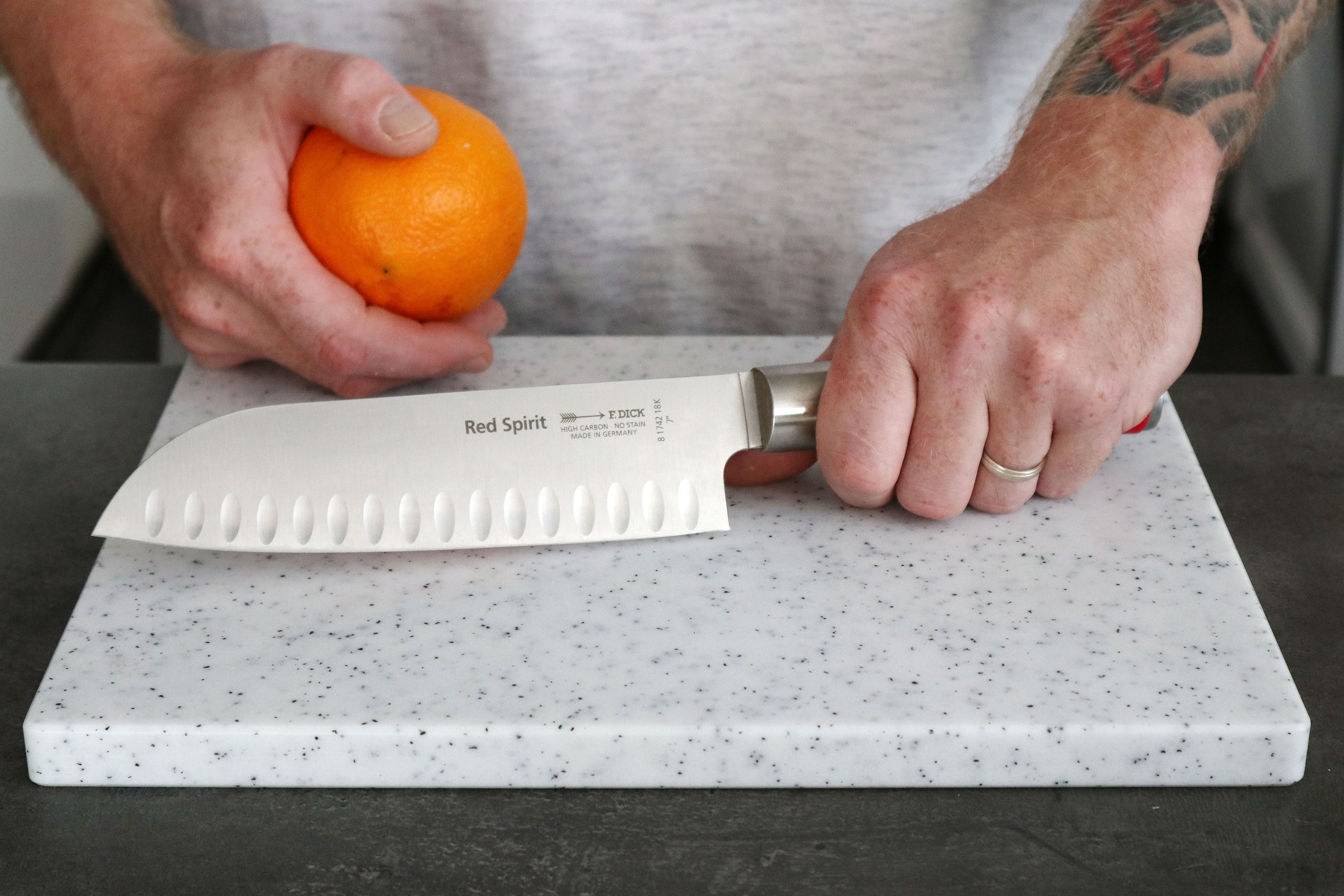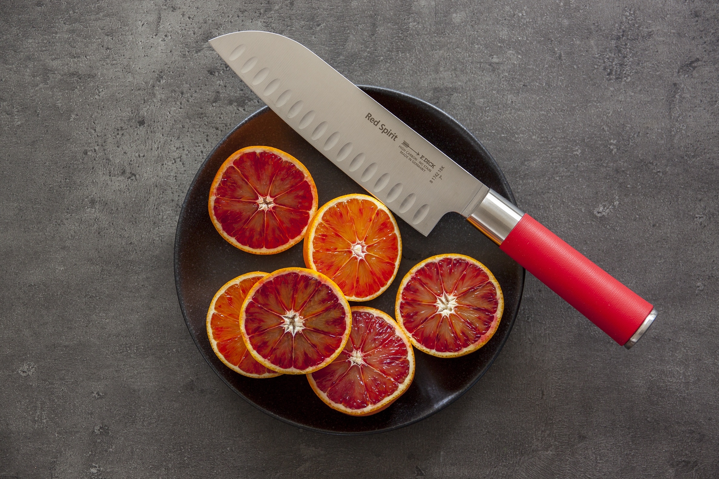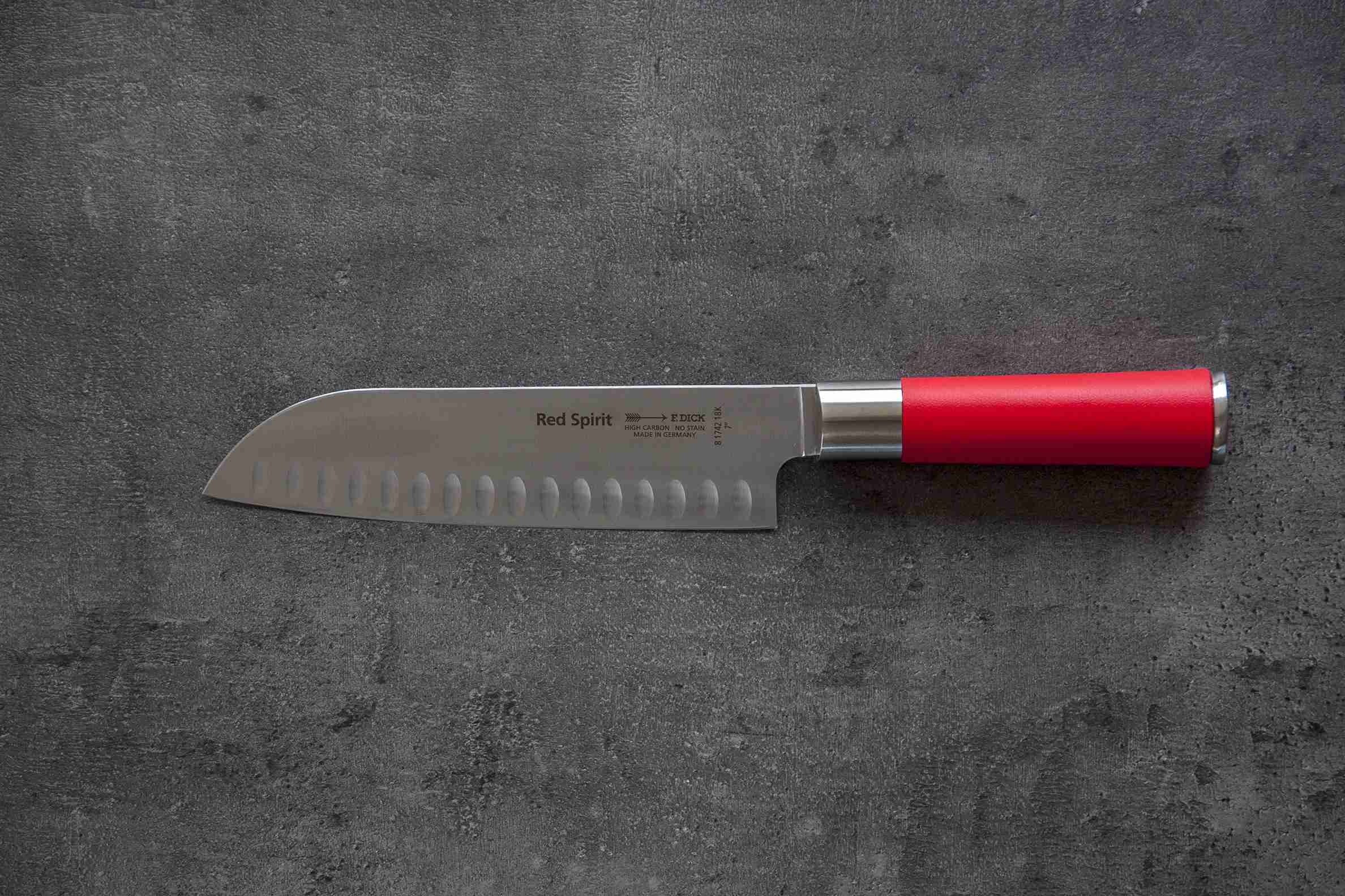 Santoku se speciálním výbrusem Dick ze série RED SPIRIT v délce 18 cm. Používá se na krájení zeleniny, ovoce, masa i bylinek. V kuchyni je univerzálním pomocníkem. Díky speciálnímu výbrusu krájený produkt neulpívá na noži. Široká plocha nože umožňuje nakrájenou zeleninu rovnou nabrat na čepel nože a vložit do pánve nebo hrnce.