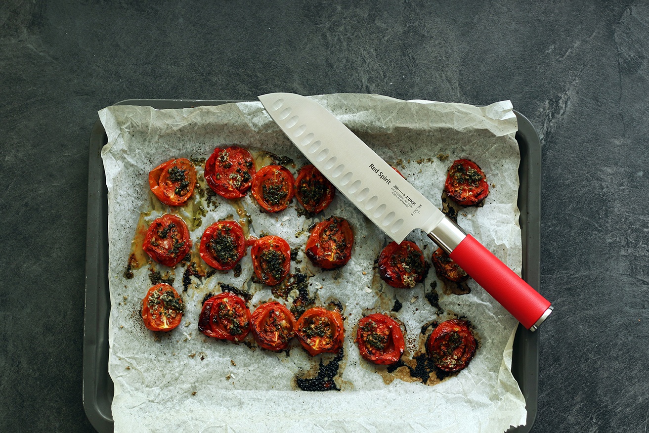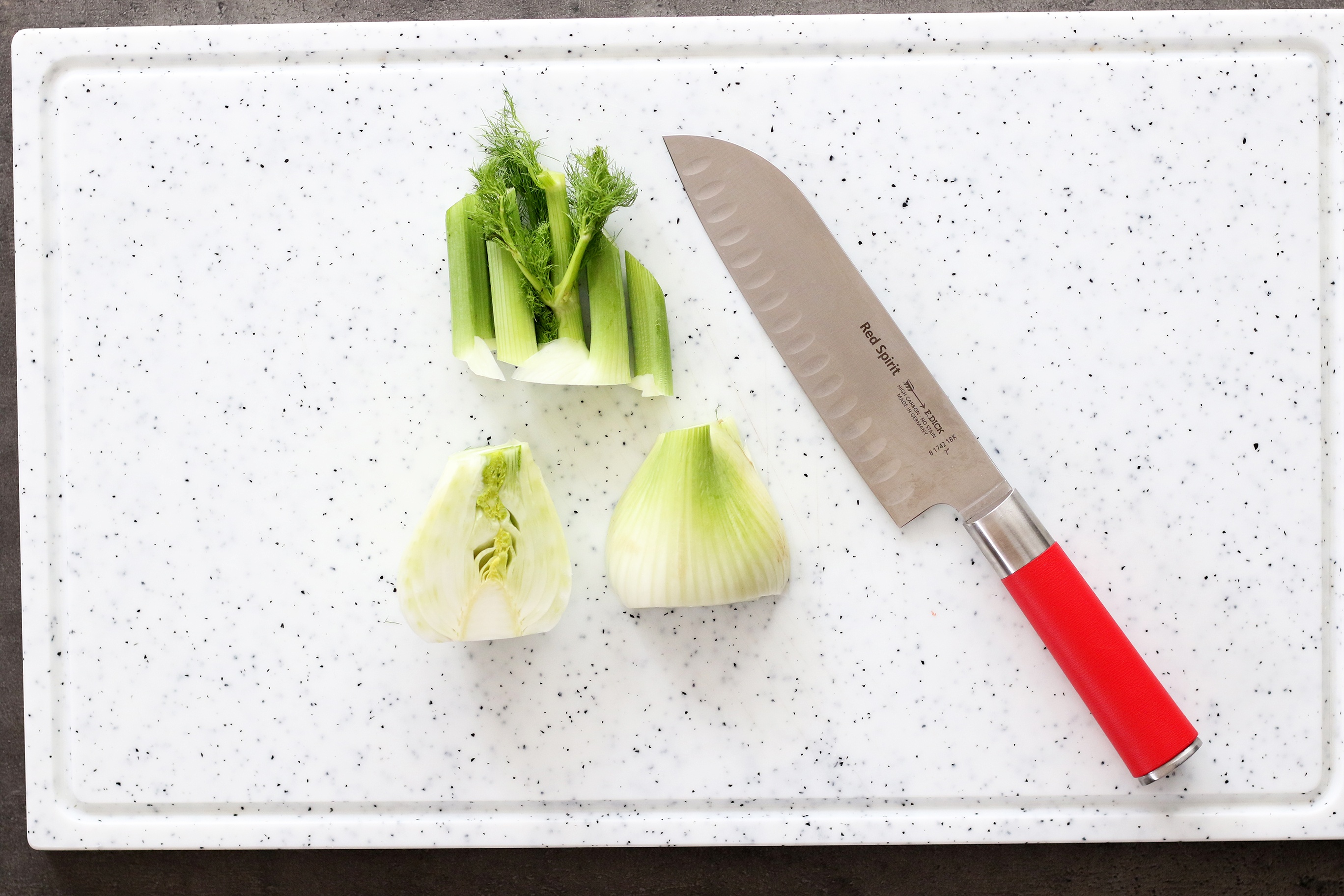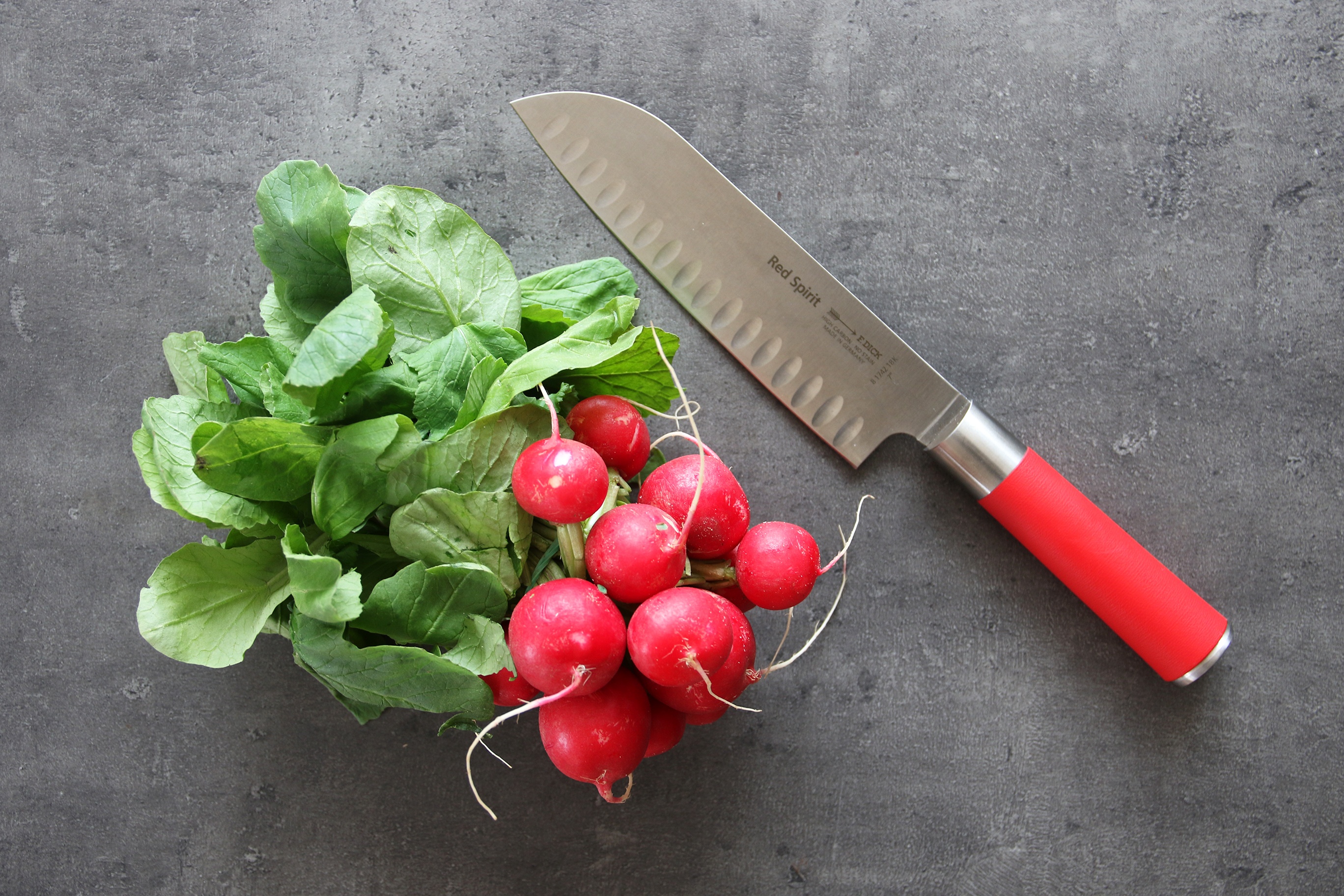Santoku se speciálním výbrusem Dick ze série RED SPIRIT v délce 18 cm. Používá se na krájení zeleniny, ovoce, masa i bylinek. V kuchyni je univerzálním pomocníkem. Díky speciálnímu výbrusu krájený produkt neulpívá na noži. Široká plocha nože umožňuje nakrájenou zeleninu rovnou nabrat na čepel nože a vložit do pánve nebo hrnce.