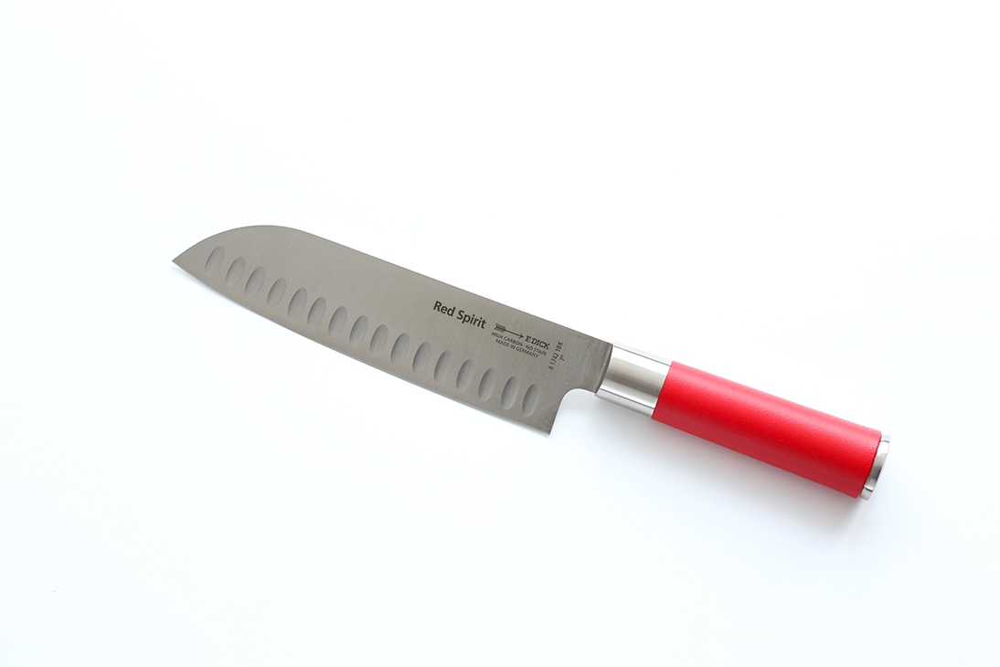 Santoku se speciálním výbrusem Dick ze série RED SPIRIT v délce 18 cm. Používá se na krájení zeleniny, ovoce, masa i bylinek. V kuchyni je univerzálním pomocníkem. Díky speciálnímu výbrusu krájený produkt neulpívá na noži. Široká plocha nože umožňuje nakrájenou zeleninu rovnou nabrat na čepel nože a vložit do pánve nebo hrnce.