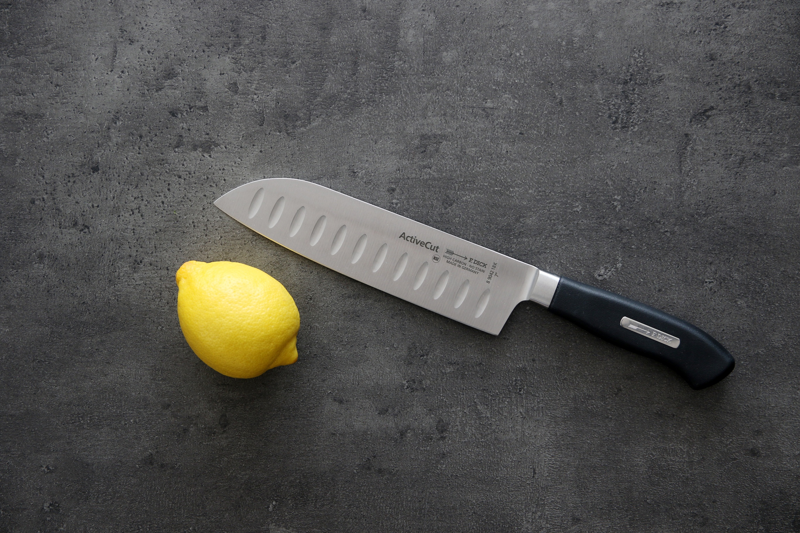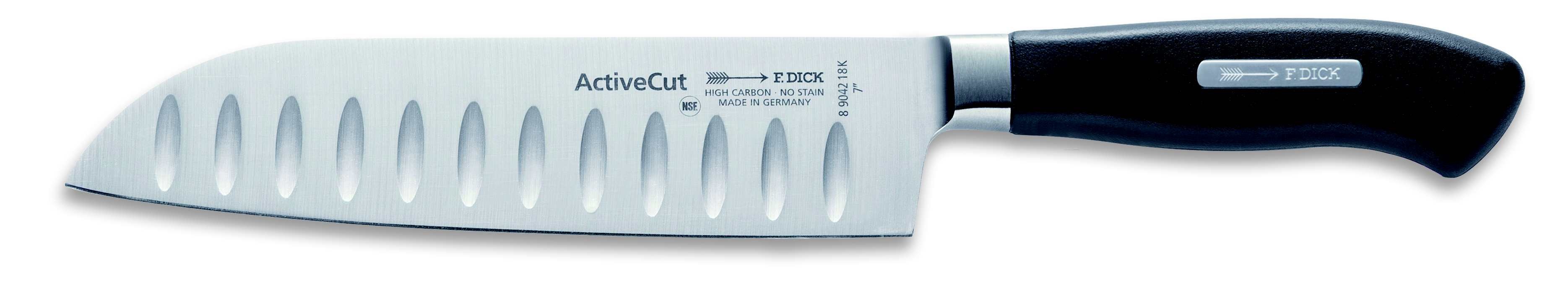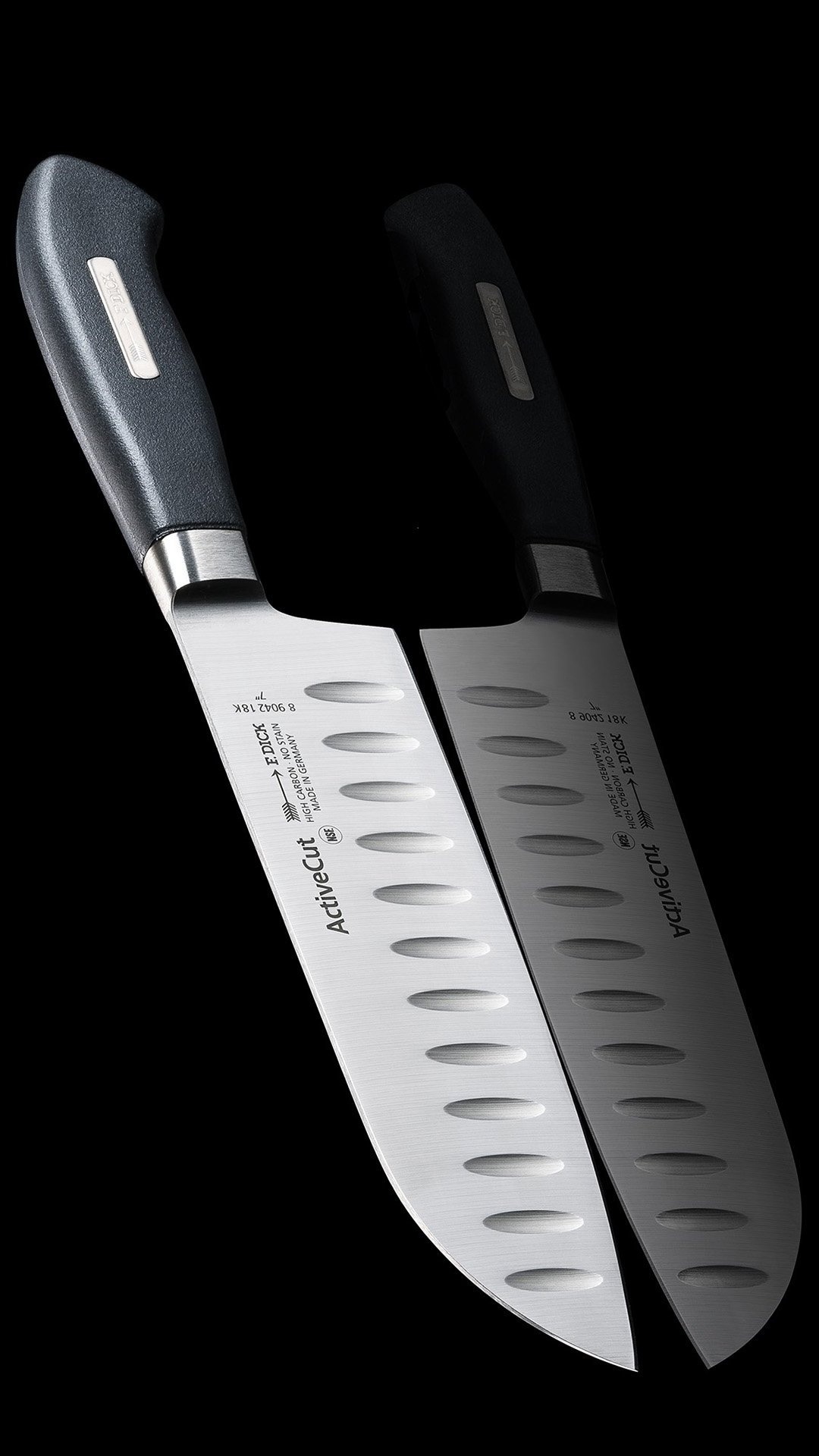 Santoku od firmy Dick se speciálním výbrusem se používá na krájení zeleniny, ovoce, masa i bylinek. V kuchyni je univerzálním pomocníkem. Díky speciálnímu výbrusu krájený produkt neulpívá na noži. Široká plocha nože umožňuje nakrájenou zeleninu rovnou nabrat na čepel nože a vložit do pánve nebo hrnce.