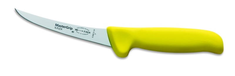 Speciální vykosťovací nůž se zahnutou čepelí, světle žlutý, poloohebný v délce 13 cm