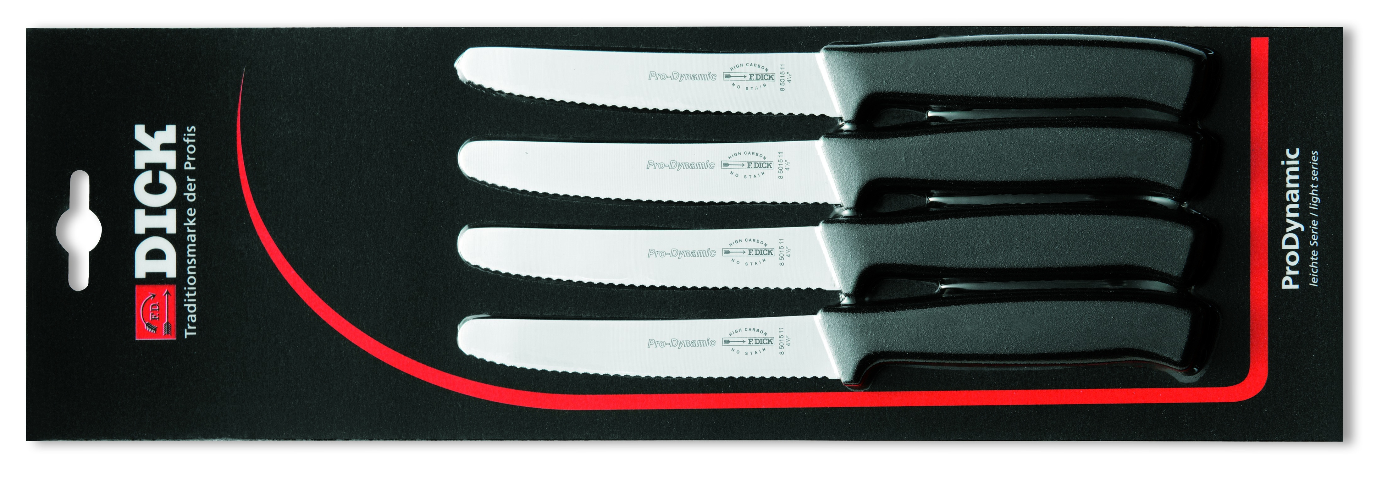 Víceúčelová 4-dílná sada nožů s nožem s vlnitým výbrusem v délce 11 cm.