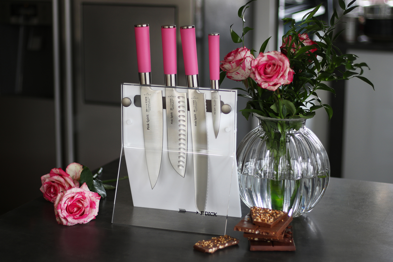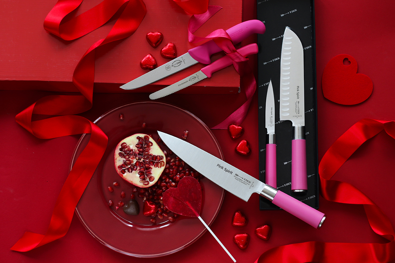 Růžové nože, to nejsou jen Pink Spirit. I když kuchařský nůž nebo dárková sada v podobě Santoku a okrajovacího nožíku udělá ke Dni žen velkou radost. Můžete kliknout i na levnější varianty. Co byste řekli víceúčelovému nožíku ze série ProDynamic? Koupíte jej v různých barevných provedení. Profesionální kuchařky možná ocení speciální nůž na maso ze série ErgoGrip s růžovou rukojetí.